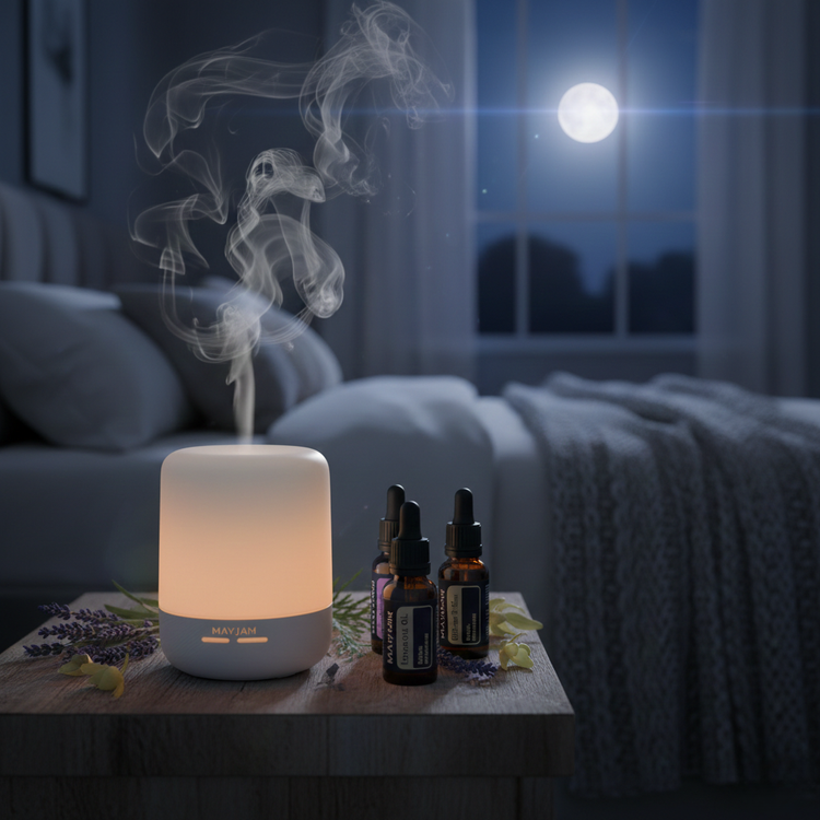 Start your Mayjam diffuser 30 minutes before you plan to sleep. Adding 5–8 drops of a Serene Night blend creates a calming aromatic backdrop that prepares your space for rest.